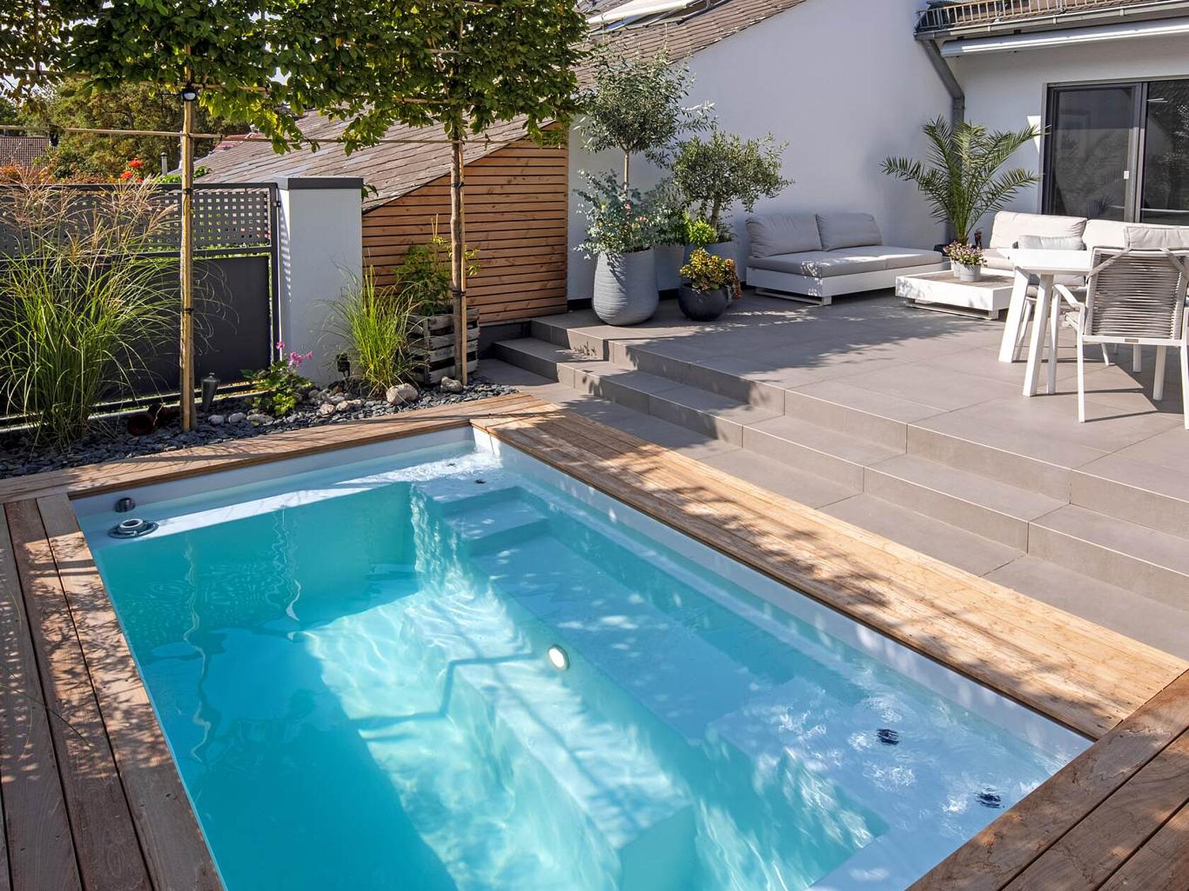 Der kompakte Minipool für die Terrasse: Genug Platz für bis zu 4 Personen oder gemütliches Ausstrecken zu zweit - dieser Pool belebt jede Terrasse und macht daraus eine schicke Aqua-Lounge.